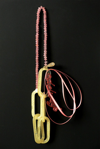 Though her new pieces also employ precious stones, silver or gold, they consist mostly of unorthodox components such as plastic covers, packing materials or pieces of wood. This attention to materials that normally would disappear in the trash lends her work an unorthodox but highly enticing aesthetical value.
